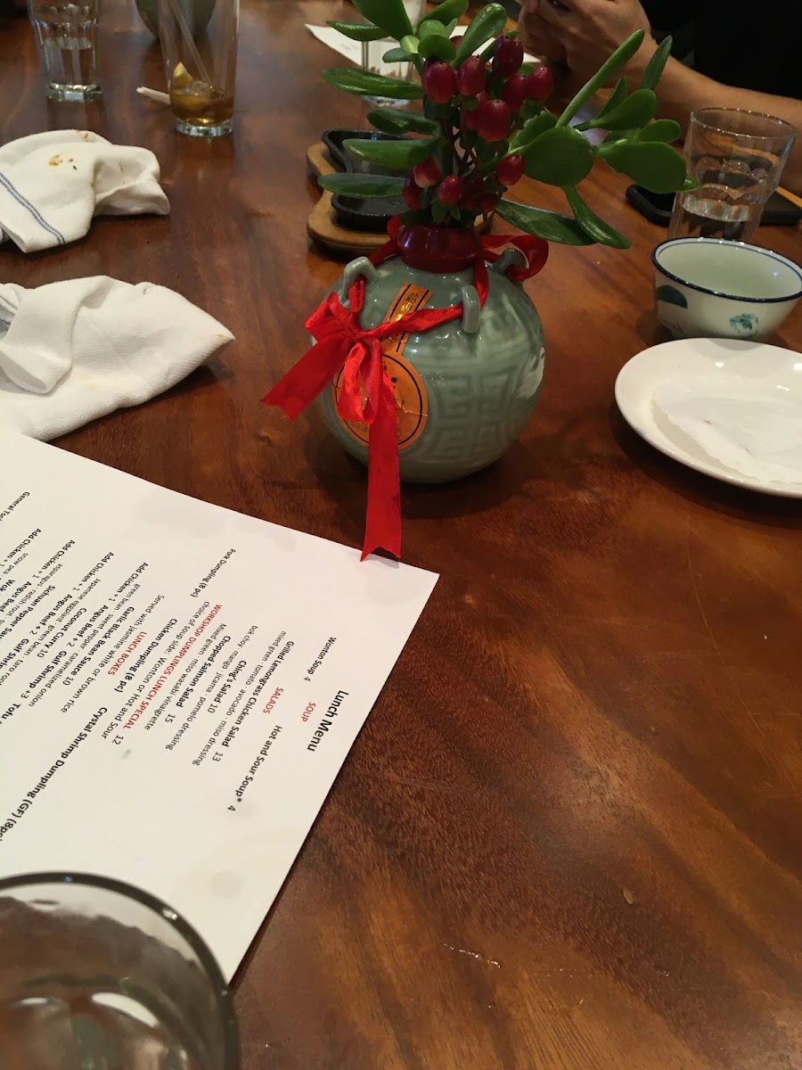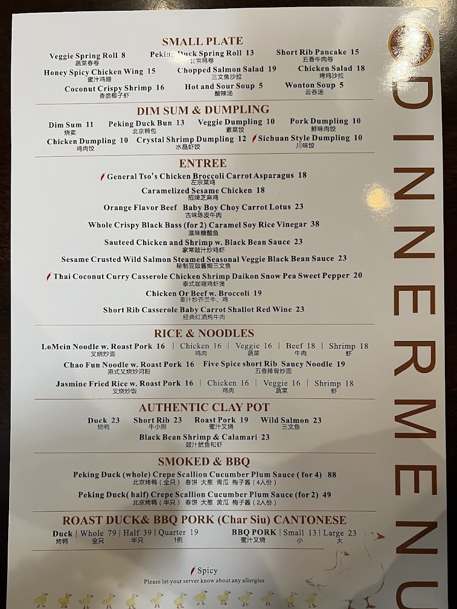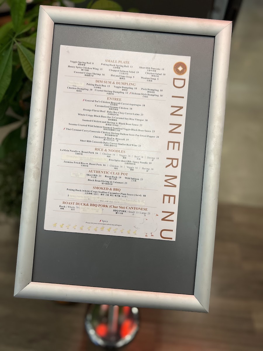 Start your meal with comforting options like the Wonton Soup or Hot & Sour Soup, perfect for easing into an inviting atmosphere. For something heartier, dishes such as the House Special Fried Rice or the 5 Spice Short Rib Noodles bring satisfying warmth and rich flavors that pair well with the restaurant’s cozy setting. The menu also features delicate dim sum-style choices like Crystal Shrimp Dumplings and Peking Duck Spring Rolls, which complement the thoughtful, attentive ambiance.